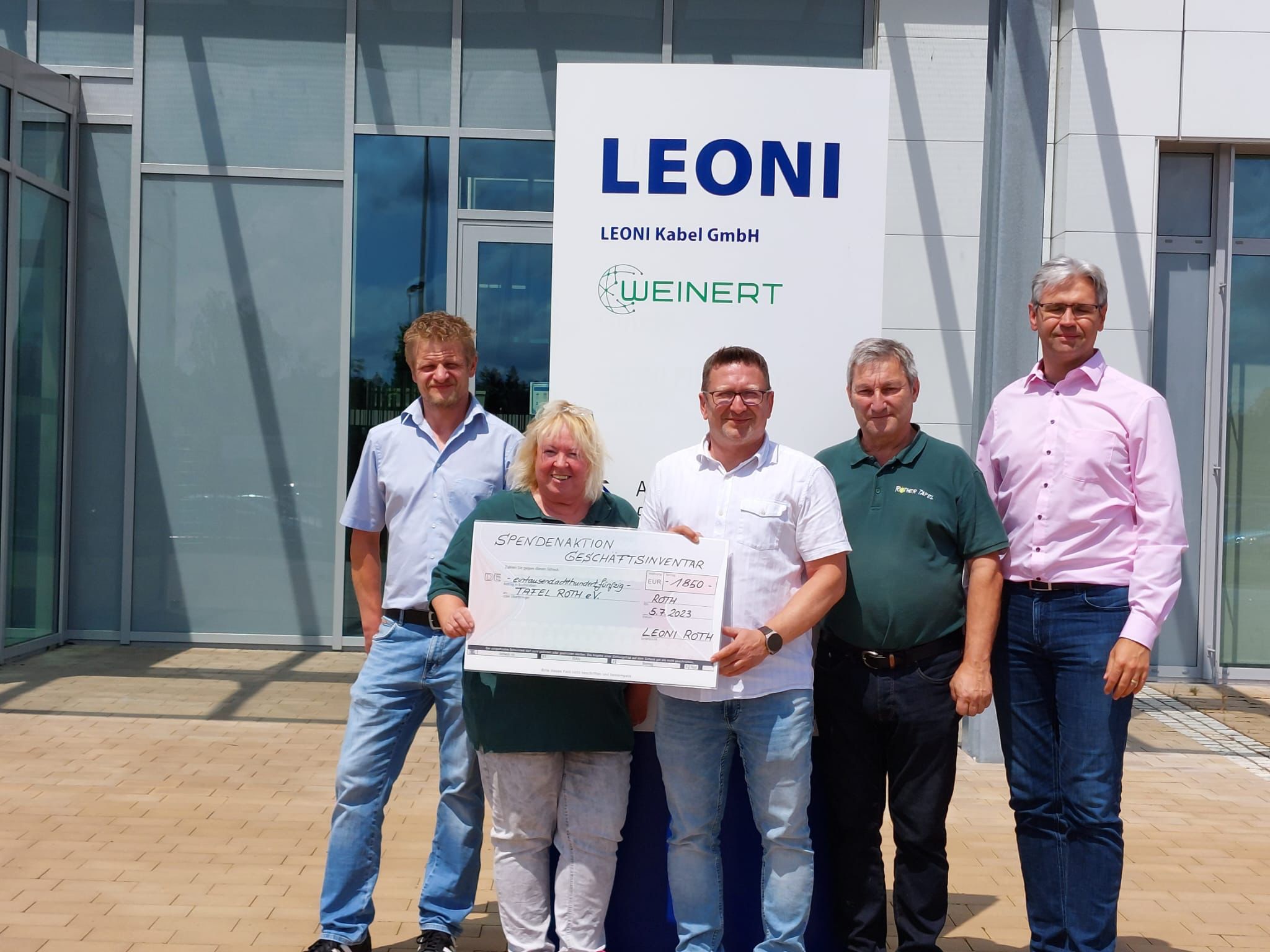 Am 5.7.2023 haben Mitarbeiter der Leoni Roth für die Tafel 1850.- Euro als Sachspende übergeben